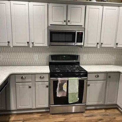 After installing new hardwood flooring on the first floor of this home, the client reached out to us again to update the kitchen. Since this client wanted to maintain the layout and keep the cabinets, we decided to paint the existing cabinets, change the backsplash, and install new countertops. The cabinets were painted to a refreshing off-white, a subtle subway tile was placed, and a beautiful quartz countertop was installed. The client was so happy with the results.