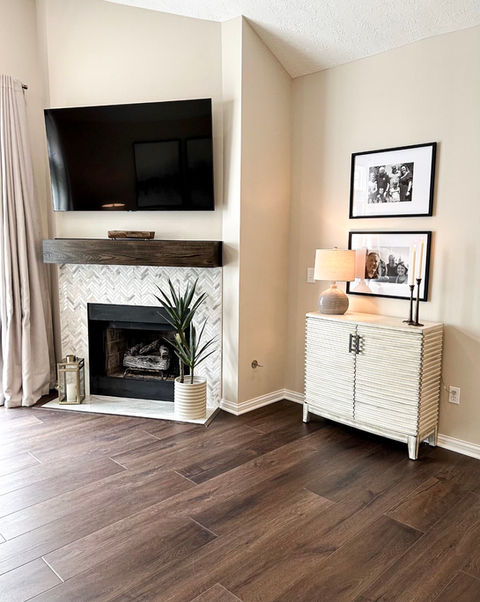 By refacing the fireplace in this living room and installing new wood flooring, we were able to brighten up this space and give it a fresh look. We and the clients were so happy with how this room turned out. Check out the before and after pictures to see just how big of a difference these changes made.